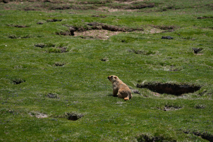 顺着地平线看去,一只喜马拉雅旱獭从洞穴中冒出头,嗅嗅周边的气味,确认安全后,探出身子在洞穴周围寻觅充饥的干草——只是它不知道,如果搬运不及时,一些储存在洞口的干草,将被迁徙而至的藏羚羊顺口吃完。