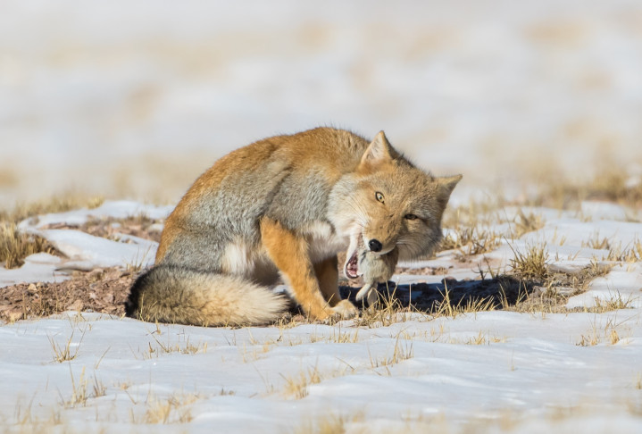 一只藏狐在可可西里五道梁附近捕食鼠兔。新华社发(孙洪摄)